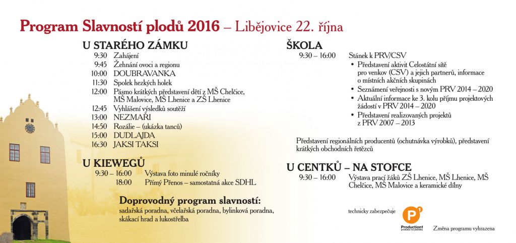 Mikroregion Chelčicko-Lhenický spolu s Místní akční skupinou Rozkvět pořádá každoročně tradiční podzimní pěstitelsko-kulturní akci Slavnosti plodů.